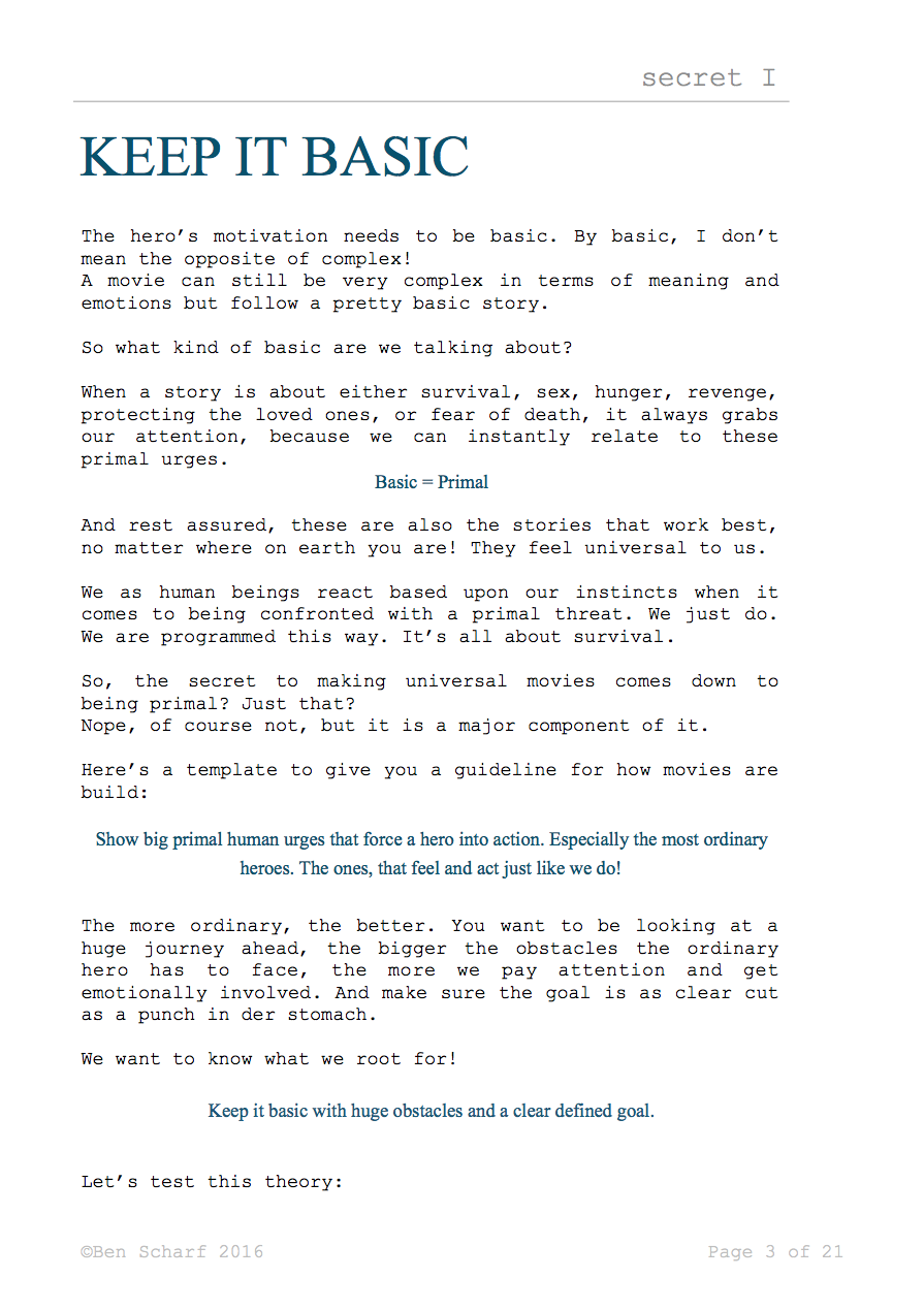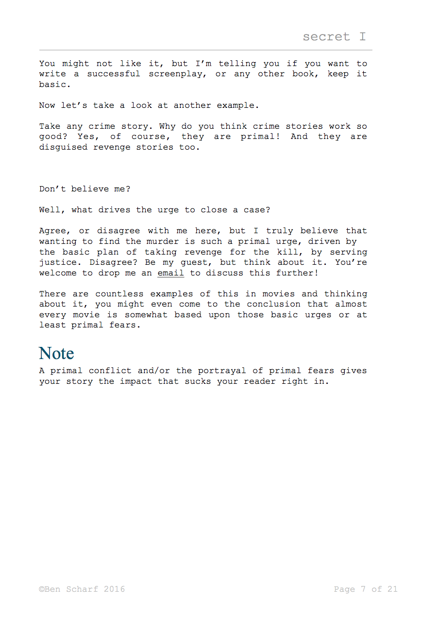 Filled to the rim with extensive knowledge on these three secrets, and hands on, easy to grasp pointers, as well as examples, to make you understand the mechanics of crafting a successful story.